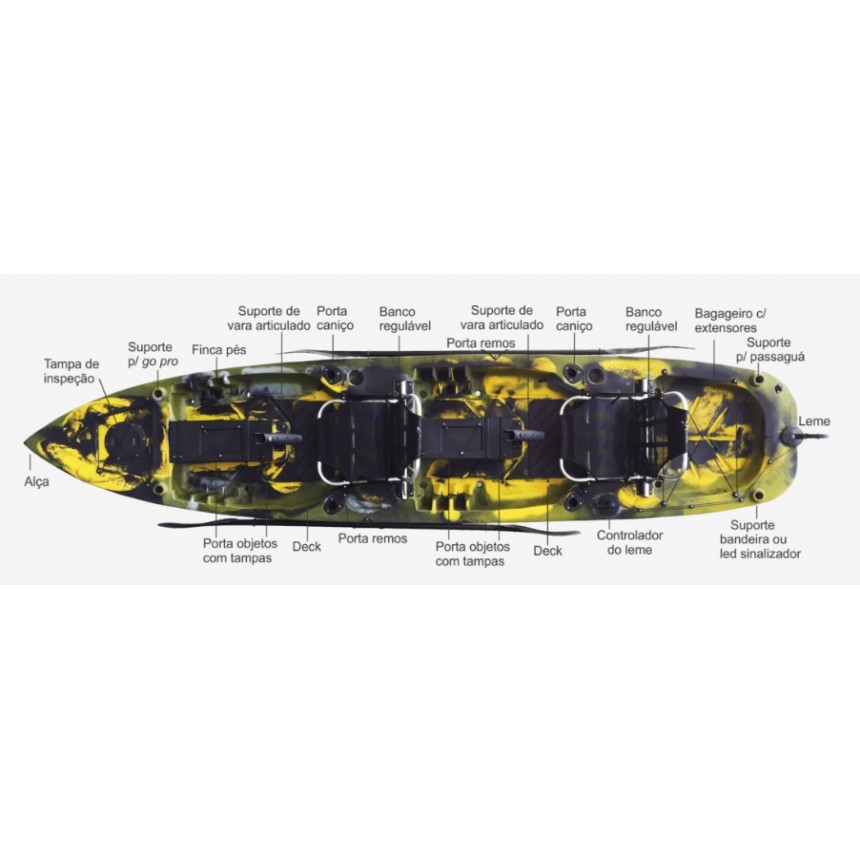 Trata-se de um caiaque com inúmeras opções para quem busca lazer ou pesca.