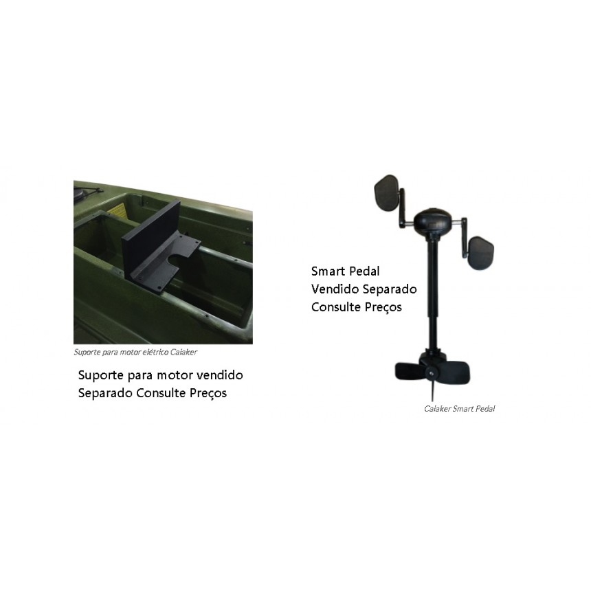 O MERO já vem pronto para a instalação do revolucionário sistema de pedal regulável (Caiaker Smart Pedal). Podem ser instalados 2 sistemas de pedal simultaneamente, um para cada ocupante. Ou ainda pode-se instalar motor elétrico de até 44 libras no compartimento em frente ao assento traseiro. Neste caso é necessário adquirir o suporte para motor elétrico da Caiaker.